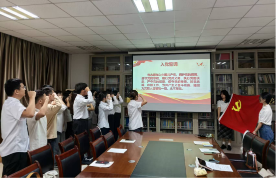 随后,在支部组织委员李向硕的带领下,新发展的5名预备党员向党旗进行入党宣誓,其他支部党员一起重温了入党誓词。