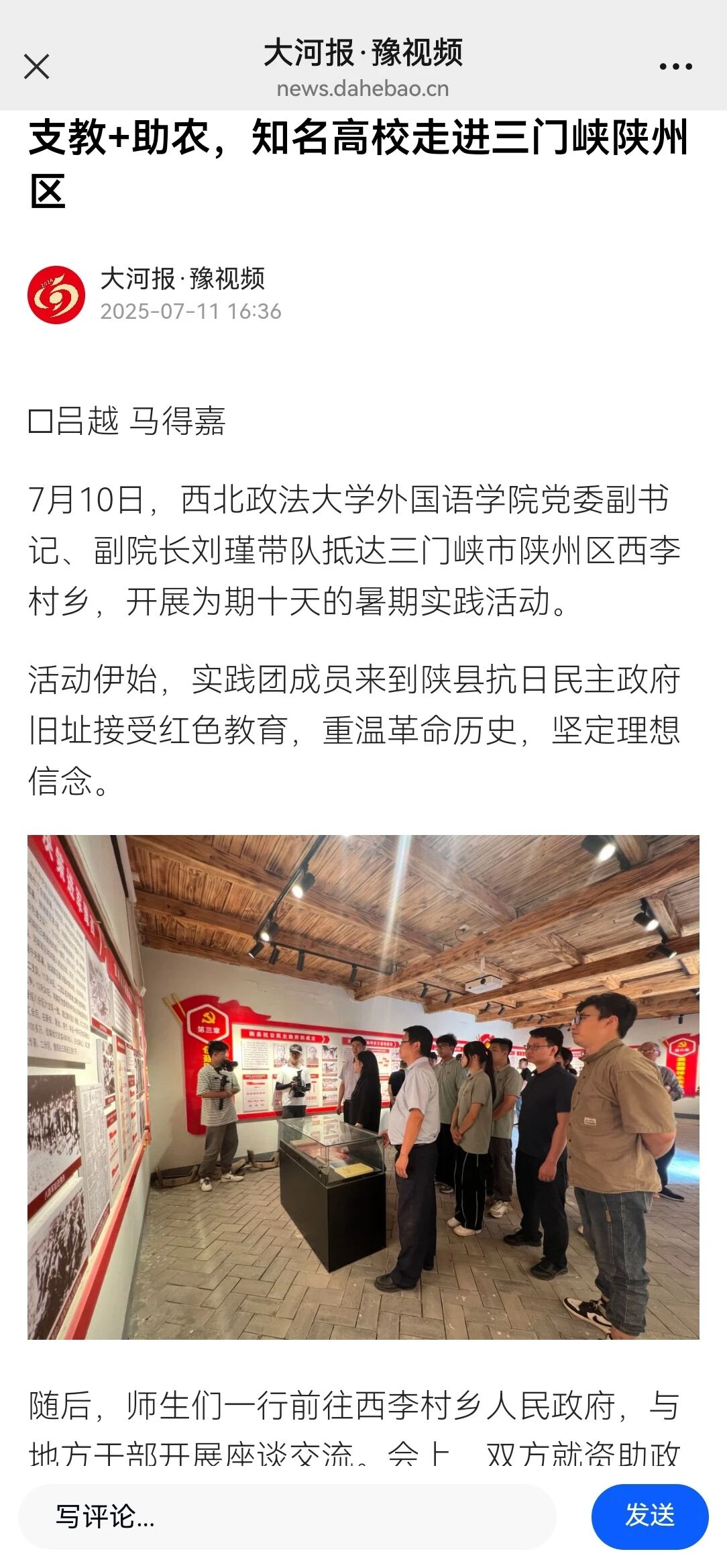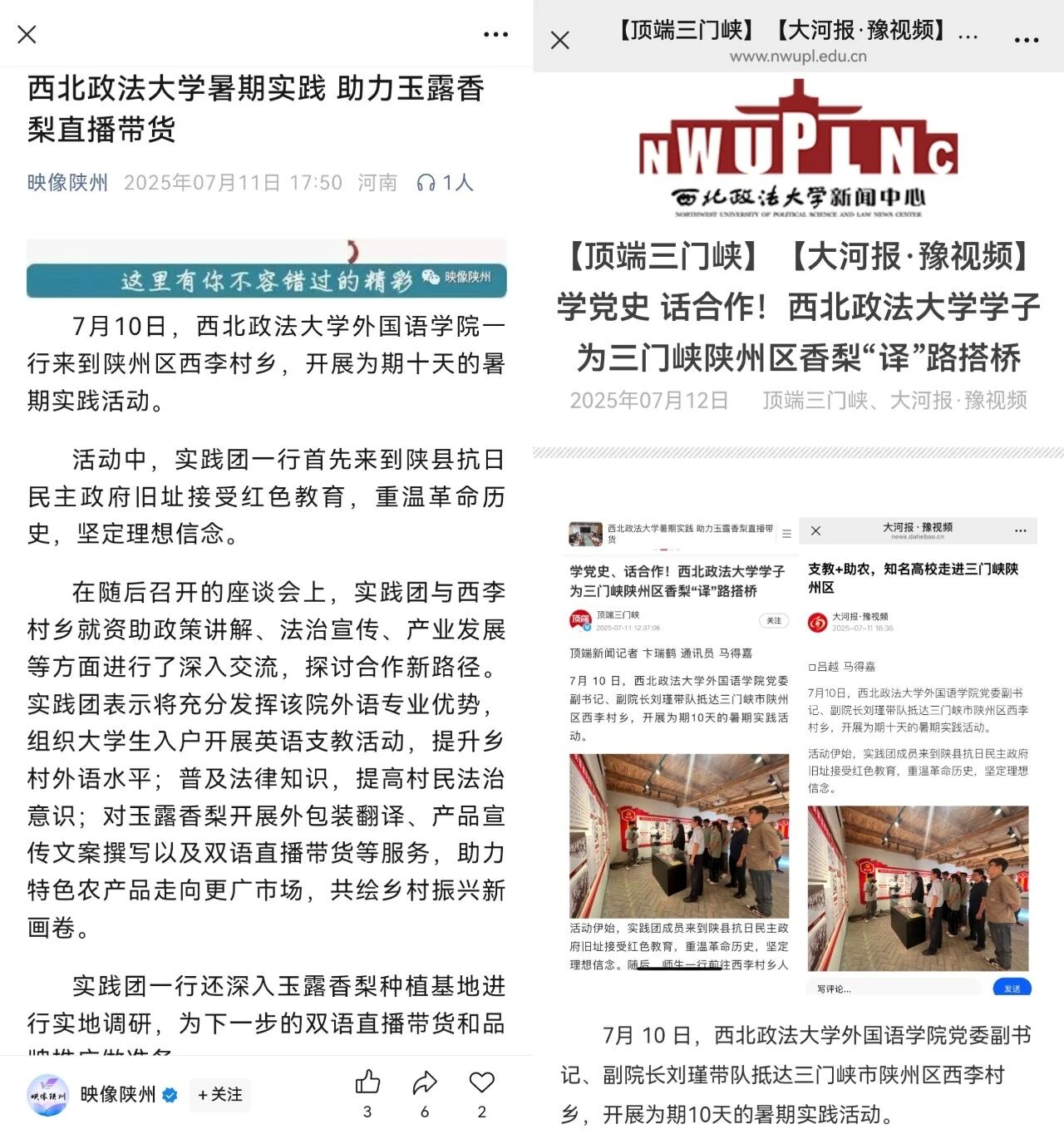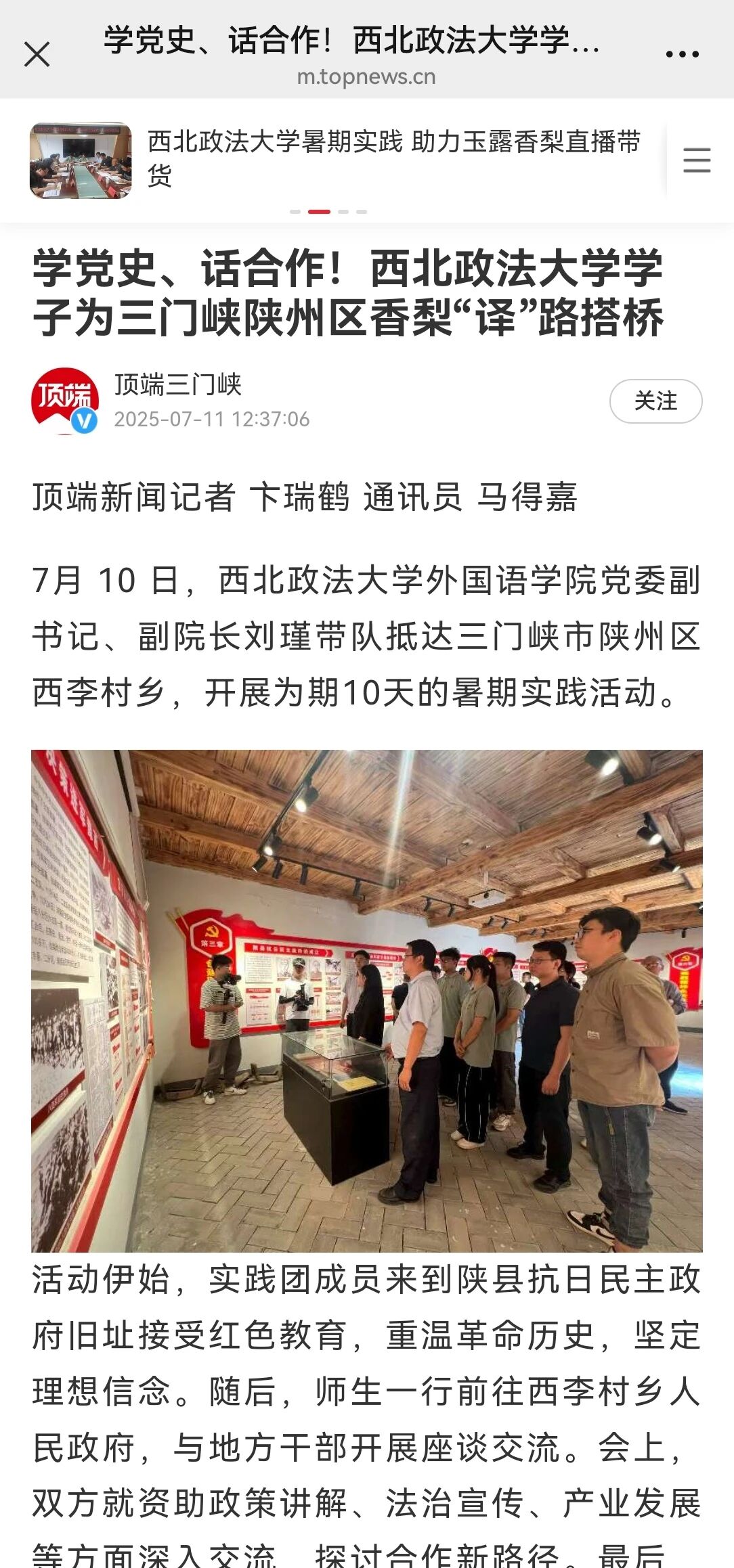 7月 10 日,西北政法大学外国语学院党委副书记、副院长刘瑾带队抵达三门峡市陕州区西李村乡,开展为期10天的暑期实践活动。