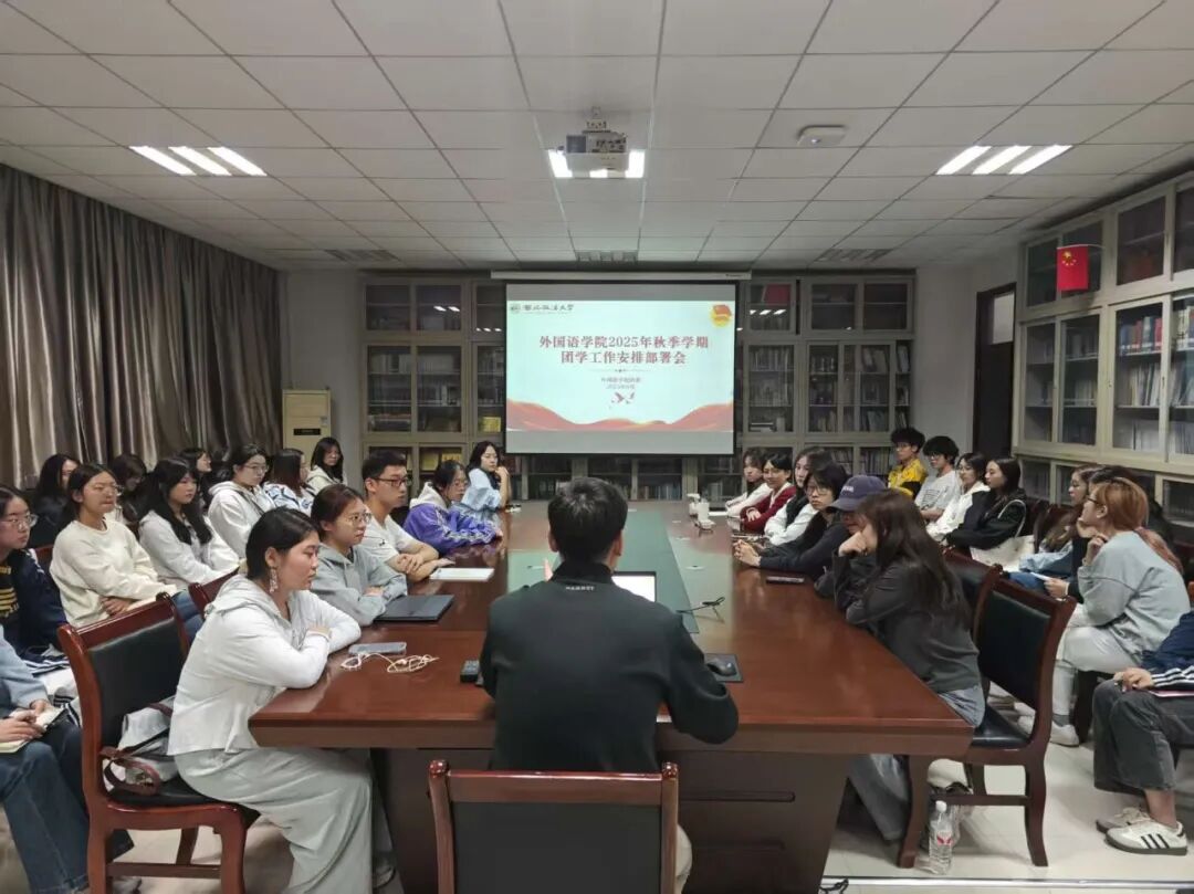 9月25日晚,外国语学院团委于Ⅲ209学院资料室召开了2025年秋季学期团学工作安排部署会,此次会议聚焦学院团学工作“提质增效”总目标,聚力提升组织力、引领力、服务力“三力”协同。学院全体团学干部、学生组织负责人参加了会议,会议由学院团委书记余瑞主持。