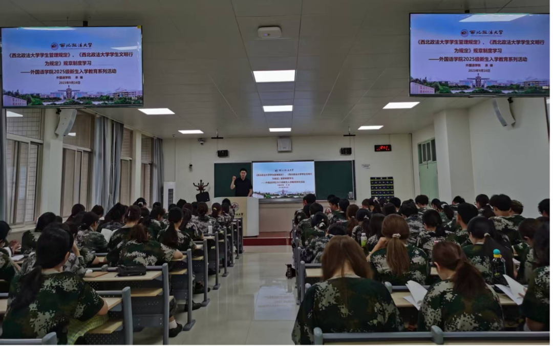 为引导新生全面了解学校的规章制度和纪律要求,帮助新生明确大学学习生活规范,强化遵纪守法意识,筑牢安全防线,促进养成良好校园生活行为习惯,9月16日晚,外国语学院召开了2025级新生校纪校规教育大会,大会由2025级新生辅导员余瑞主讲。