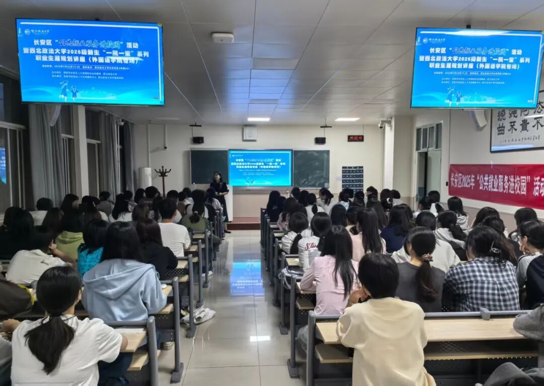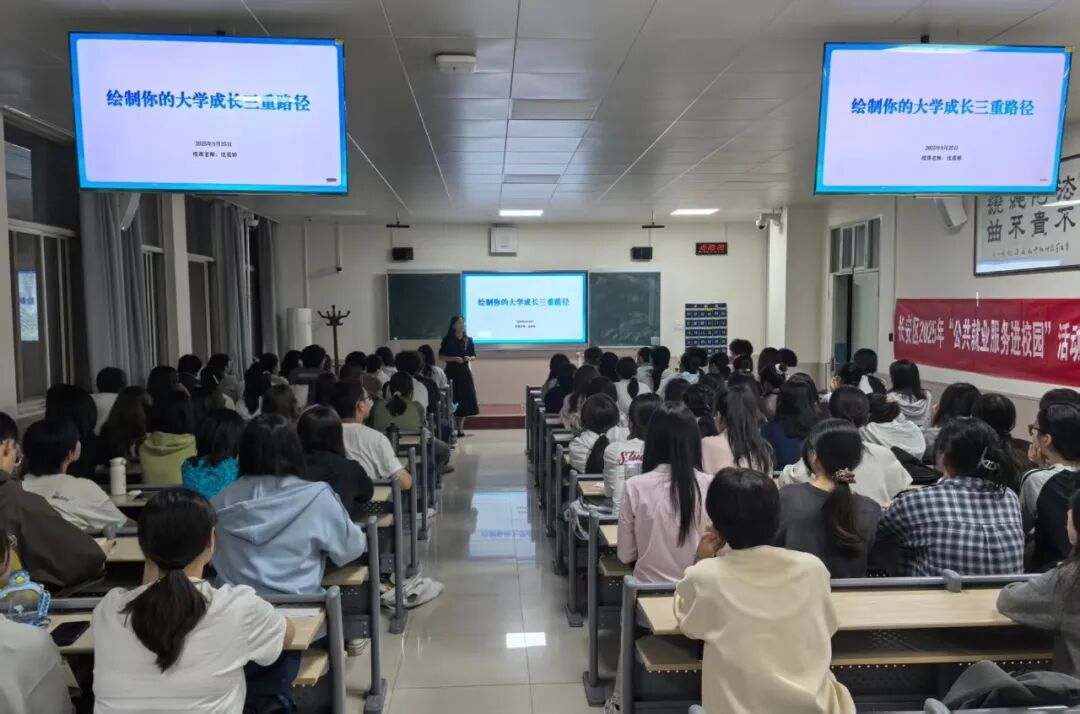 为帮助2025级新生尽快适应大学生活,明确职业发展方向,提升职业规划意识和能力,尽早清晰学业发展路径,9月25日晚,外国语学院召开长安区“就业公共服务进校园”活动暨2025级本科新生“一院一策”系列职业生涯规划讲座。此次讲座是由学校招生就业办与长安区人社局联合举办,讲座由长安区人社局工作人员沈婷主讲。