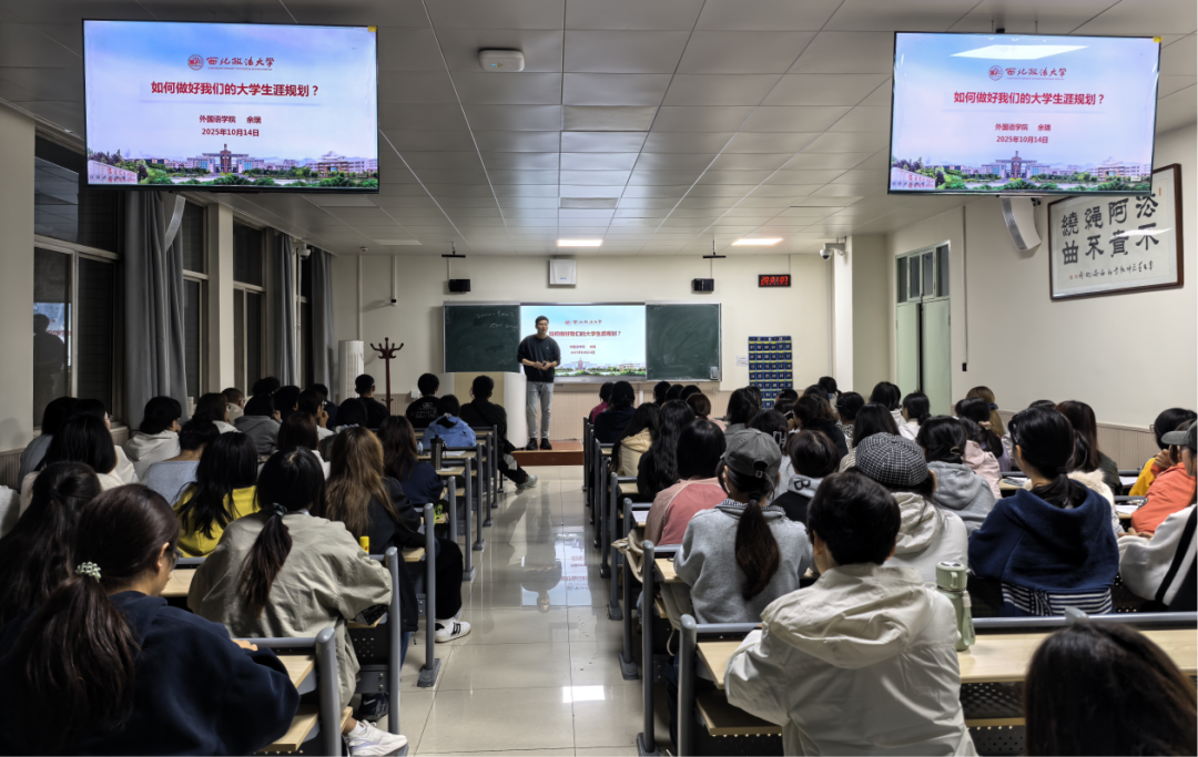 为助力外国语学院2025级本科新生明晰职业方向、提升就业竞争力、科学谋划大学四年学业和职业规划。10月14日晚,外国语学院召开2025级本科新生职业规划讲座。讲座由外国语学院2025级新生辅导员余瑞主讲,全体本科新生参会。