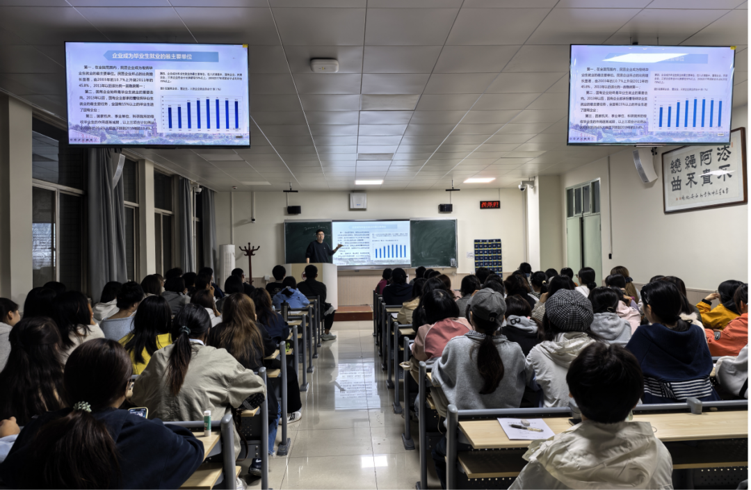 余瑞以“如何做好我们的大学生涯规划”为主题开展宣讲。他结合近年来学院毕业生毕业去向数据的向学生详细讲解了英语(法律英语方向)专业特点,告知学生应主动拥抱“英语+法律”专业的独特优势,学好专业课,积极参加各类赛事活动,不断提升自身综合竞争力。同时也对公务员、事业单位、教师、银行等职业的招聘要求和部分央企、国企、外企等招聘条件要求进行分析解读,提醒同学们要提前对未来从事职业有清晰的认知,提早树立职业规划意识,将专业学习与未来发展紧密结合,在多元的职业赛道上找准属于自己的成长路径。讲座结束后,不少新生表示深受启发,对未来的职业发展有了更清晰的认识。