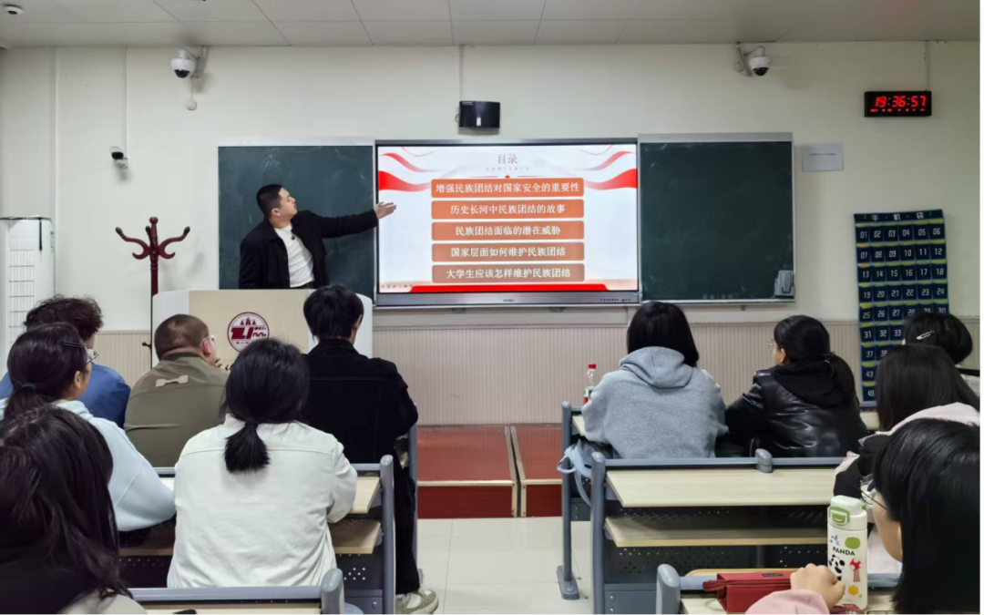 宣讲人结合“茶马古道”“唐蕃会盟”等多个展现民族团结融合的历史案例,阐释了中华民族多元一体的形成脉络,通过当代民族团结的具体事例展现了各民族人民交往交流交融的生动实践。宣讲人指出,民族团结是国家安全与社会稳定的重要基石,在当前国内外严峻的形势下,同学们必须牢固树立中华民族共同体意识,坚决防范和抵制民族分裂势力的渗透破坏。