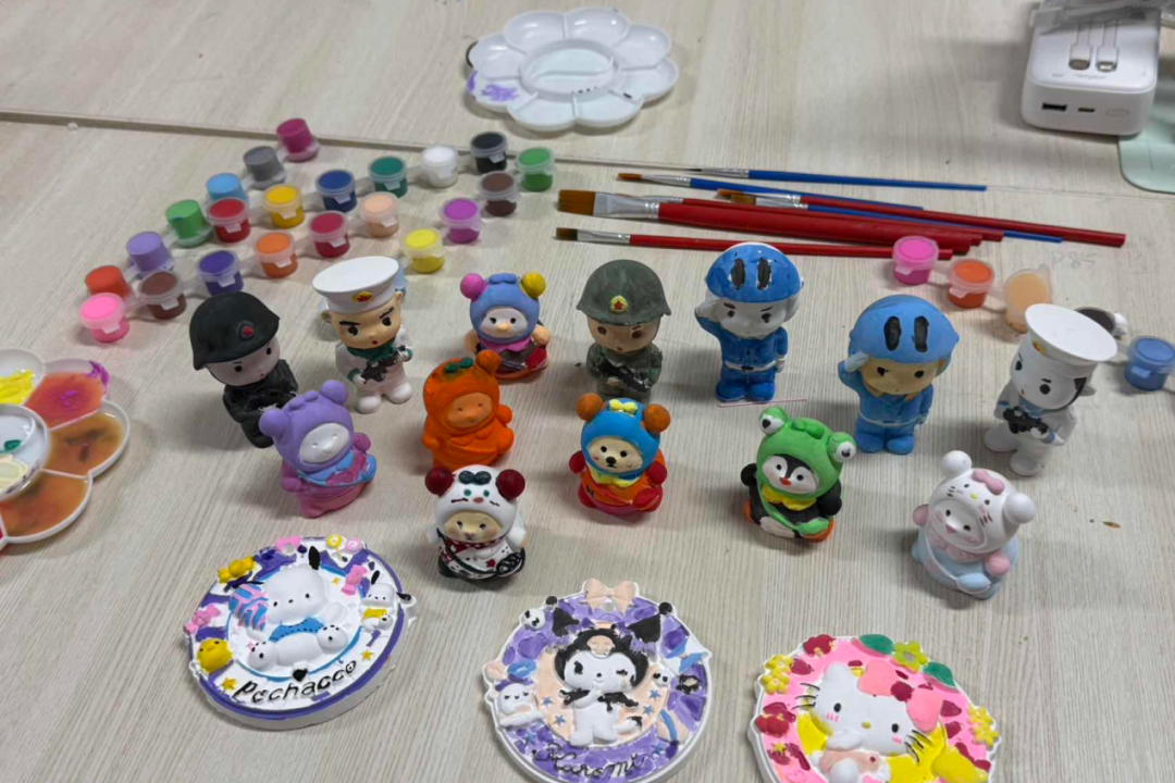 活动现场,张静文从铅笔勾勒轮廓、丙烯颜料调配,到细节涂色的笔触控制一一向参与的同学们细致讲解石膏娃娃绘制的具体步骤与关键技巧。同学们相互交流技巧、分享灵感并结合创作理念畅谈心中体会,在艺术体验中感受团队合作的喜悦与精神共鸣。一个个洁白的石膏娃娃被赋予鲜艳的爱国色彩,爱国情怀在此刻变得鲜活和具体起来。