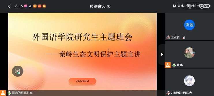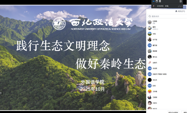 为深入贯彻生态文明建设理念,引导全院学生树立 “守护秦岭、人人有责” 的生态文明意识,11月1日,外国语学院依托线上平台,面向各年级学生开展系列秦岭生态保护宣传教育活动,在传递生态保护知识的同时强调日常活动安全与纪律要求,确保宣传教育走深走实。本次年级大会由外国语学院辅导员崔玮、余瑞、张远麒主讲,学院各年级研究生、本科生参加。