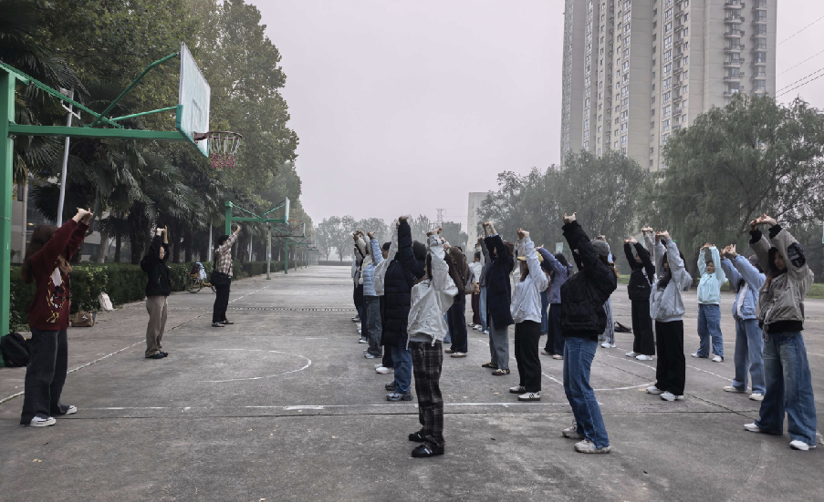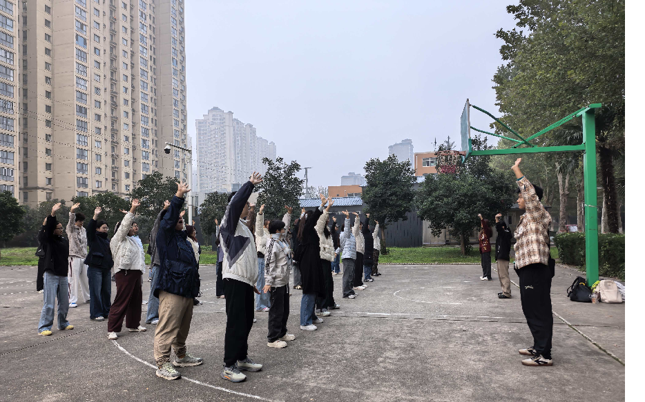 一年之计在于春,一日之计在于晨。为进一步提高学生身体素质、缓解日常学习生活压力、培养新生养成良好生活习惯,减轻学生心理压力,以健康的体魄、饱满的热情投入到丰富多彩的校园文化生活中。10月份,外国语学院组织2025级本科新生在学校篮球场开展学习“八段锦”健身操特色系列活动。