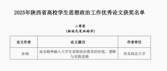 10月30日,陕西省高等学校思想政治教育研究会辅导员工作研究分会发布了《关于公布2025年“陕西省高校学生思想政治工作研究论文与工作案例征集活动”评选结果的通知》,我院辅导员余瑞申报的《延安精神融入大学生思想政治教育的价值、逻辑与实践进路》一文,荣获2025年陕西省高校学生思想政治工作优秀论文二等奖。