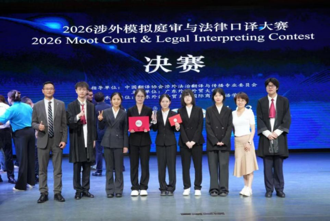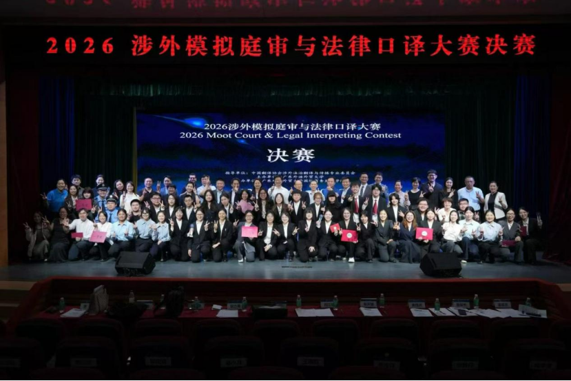 近日,“2026涉外模拟庭审与法律口译大赛”决赛在广东外语外贸大学举行。我校代表队从全国数十所参赛高校中脱颖而出,荣获大赛决赛二等奖;龚怡欣同学凭借出色表现荣膺 “最佳公诉人”个人奖项。本赛事由中国翻译协会涉外法治翻译与传播专业委员会提供专业指导,是目前国家级大学生竞赛中唯一以涉外庭审与法律翻译为核心特色的跨学科场景融合型赛事,旨在深化涉外法治人才培养,推动法学与语言学科交叉融合。