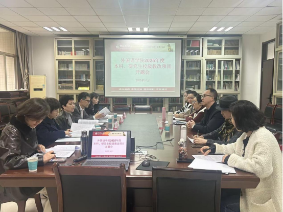 为深入推进教育教学改革,创新解决外语人才培养中的重点与难点问题,10月23日,外国语学院在学院资料室组织召开了2025年度本科、研究生校级教育教学改革研究项目开题会。经济学院徐梅教授、政治与公共管理学院龚会莲教授、高教所余涛研究员、高教所郭艳利副研究员及外国语学院张琳教授担任指导专家。本年度获批立项的各项目负责人参会,副院长陈河主持会议。