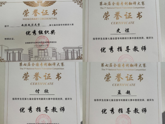 近日,第七届全国专利翻译大赛公布获奖名单,我院学生获多项殊荣,其中汉译英组三等奖1人,获英译汉组三等奖2人,获汉译英组优秀奖3人,获英译汉组优秀奖2人。我校因赛事组织工作出色荣获 “优秀组织奖”,学院付欣副教授、史煜副教授、孟超博士等3位老师荣获“优秀指导老师”称号。