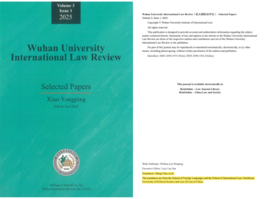 近日,我院法律翻译中心师生负责翻译完成的Wuhan University International Law Review: Selected Papers(Vol. 3 Issue 1, 2025)[《武大国际法评论》2025年英文版]在美国正式出版,并被China Law & Society Library系列丛书收录于HeinOnline法学期刊全文数据库。